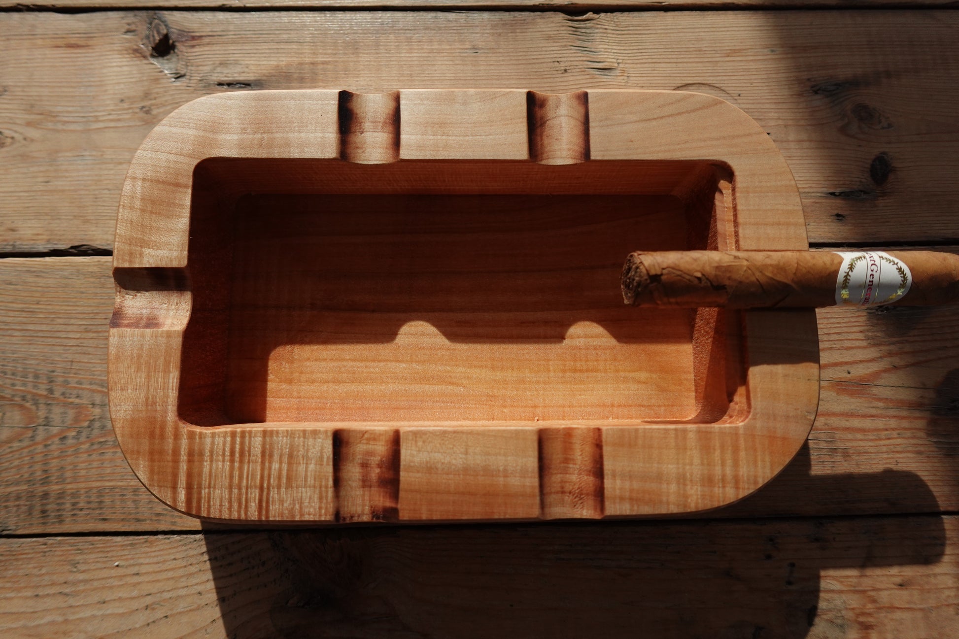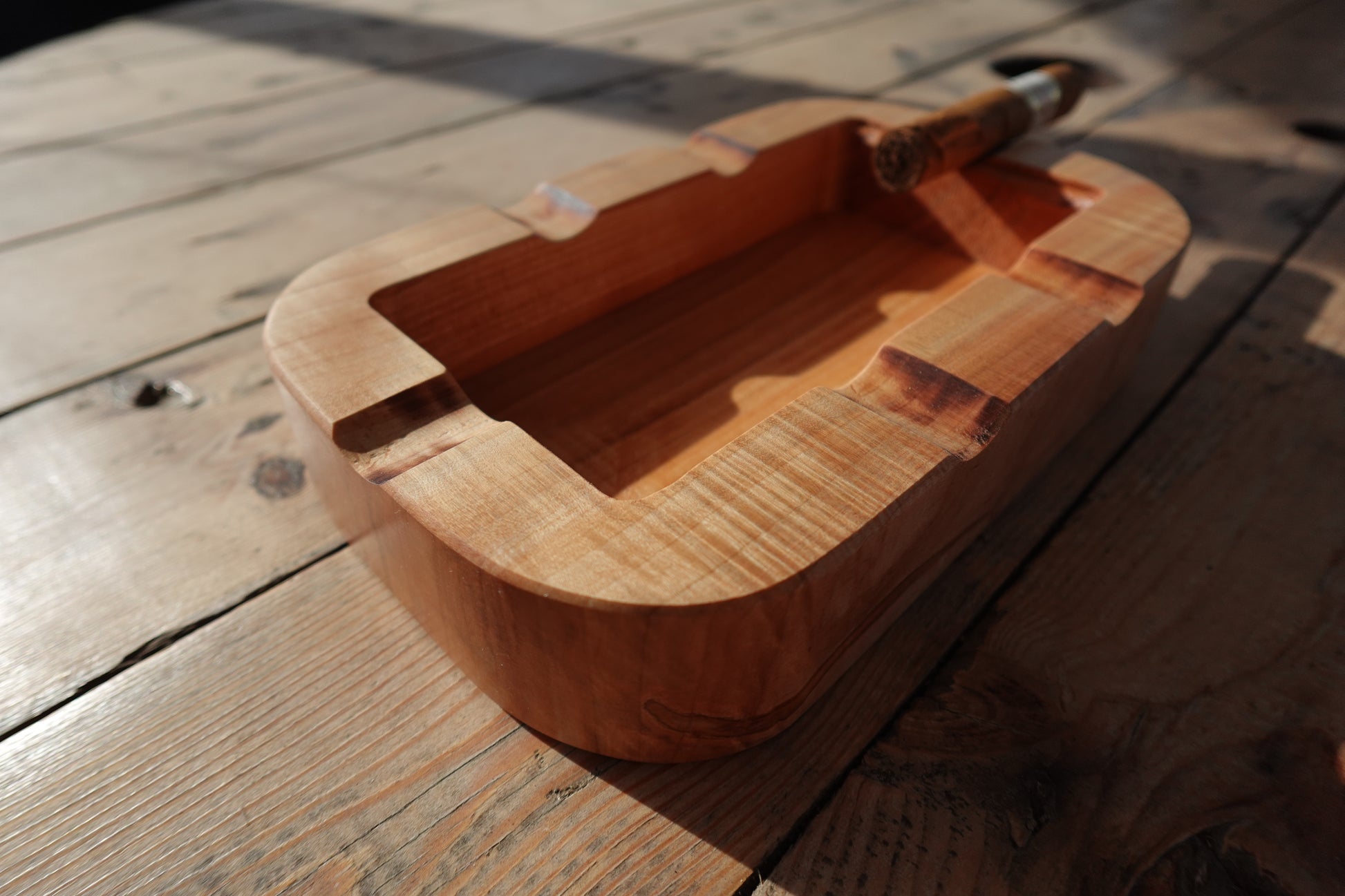 Crafted from premium Indiana maple, this 6-finger cigar ashtray features a food-safe oil finish that highlights its stunning chatoyance. Designed for both solo relaxation and social enjoyment, it offers a refined resting place for your cigars, enhancing your smoking experience with durability and elegance.