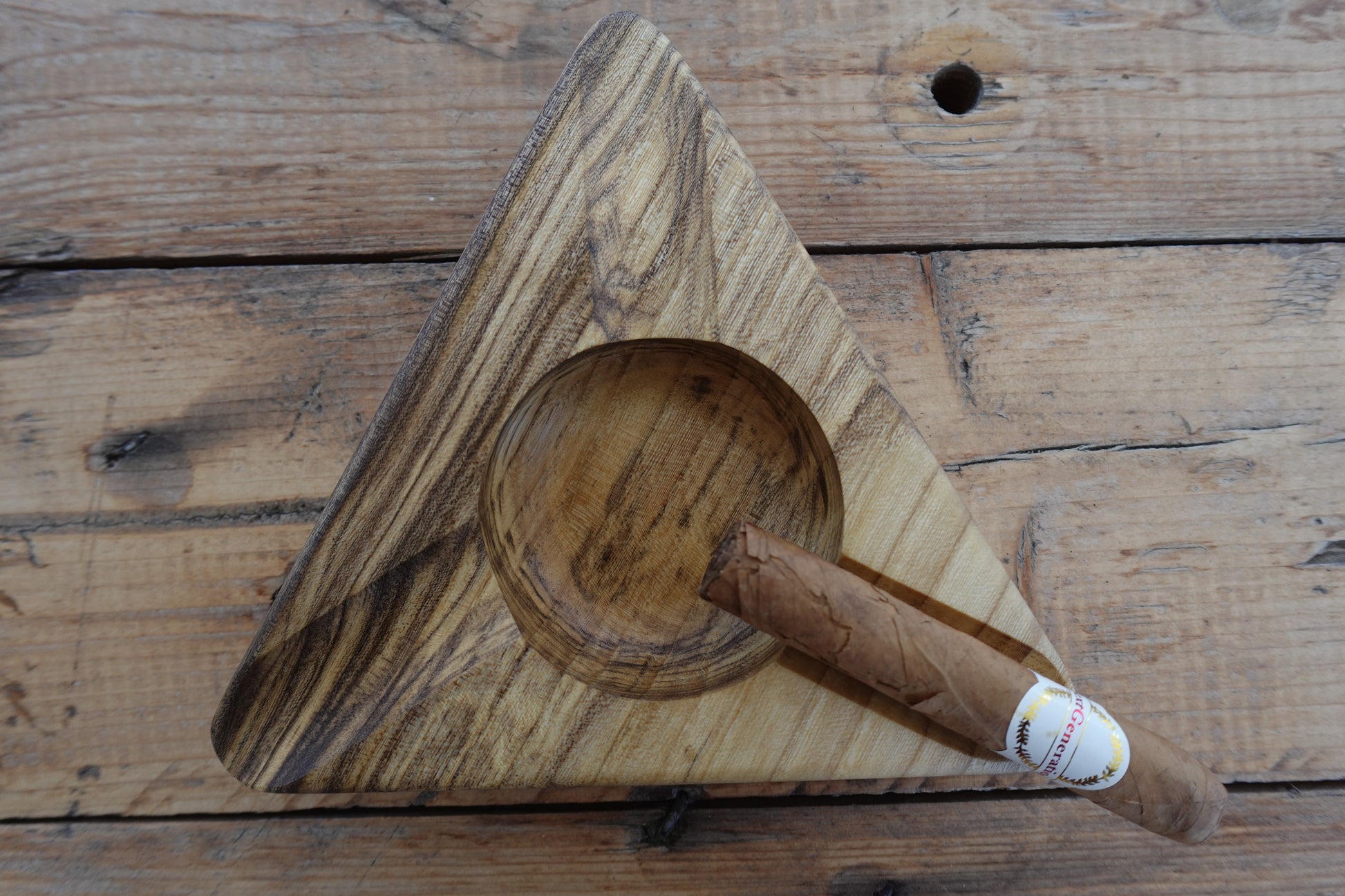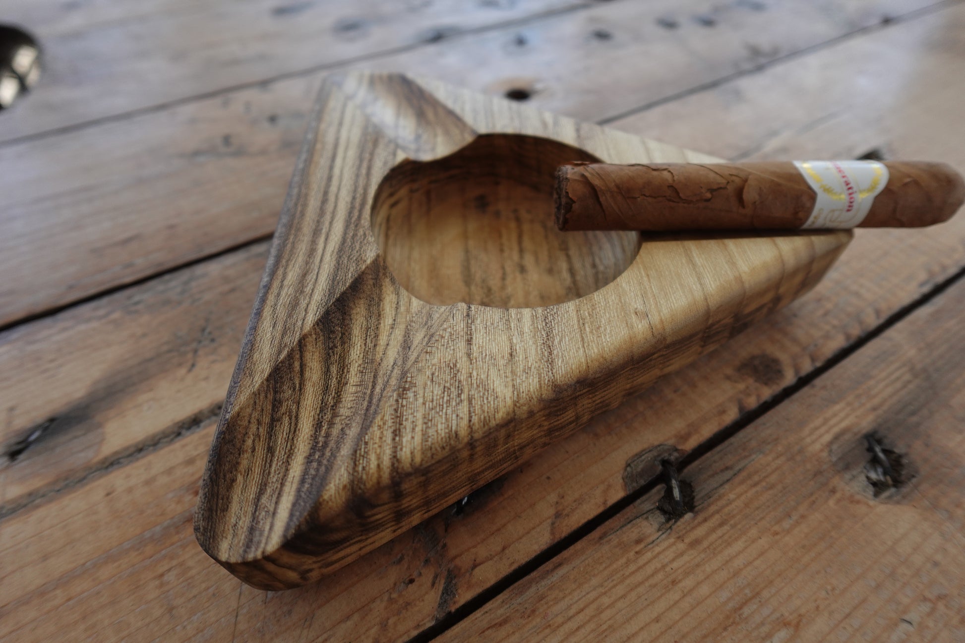 This Spalted Indiana Ash Triangle Ashtray is expertly crafted by cigar enthusiasts to meet the needs of fellow smokers. Made from spalted Indiana ash wood, it features a distinctive natural pattern and a durable hard oil finish that enhances its longevity and resistance to heat. Its triangular design offers a stable and elegant resting place for cigars, combining functionality with refined craftsmanship for a superior smoking experience.