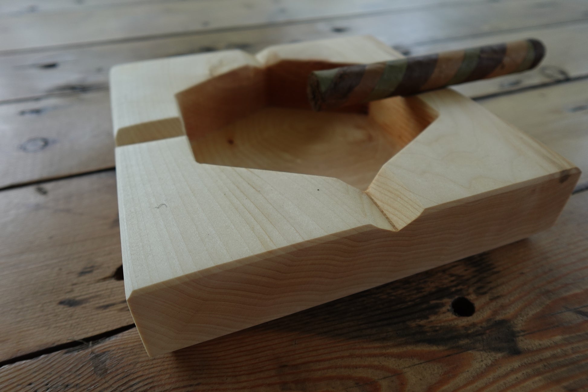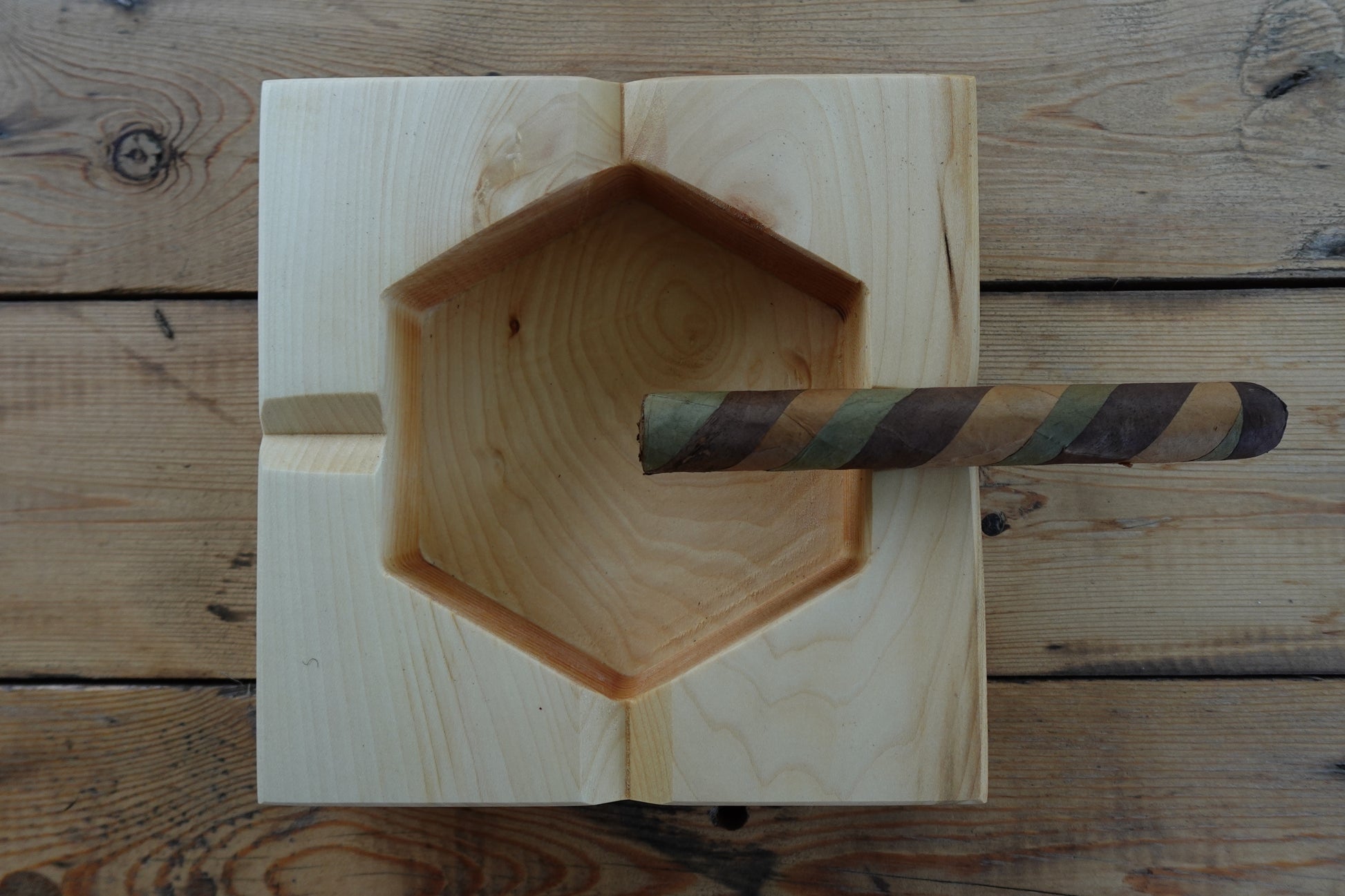 This expertly hand-crafted Indiana Pine ashtray features a beveled base and hexagonal tray design. The food safe oil finish adds durability and enhances the natural beauty of the wood. Perfect for cigar enthusiasts, this ashtray holds up to four cigars at a time. 8" x 8" x 2" size.