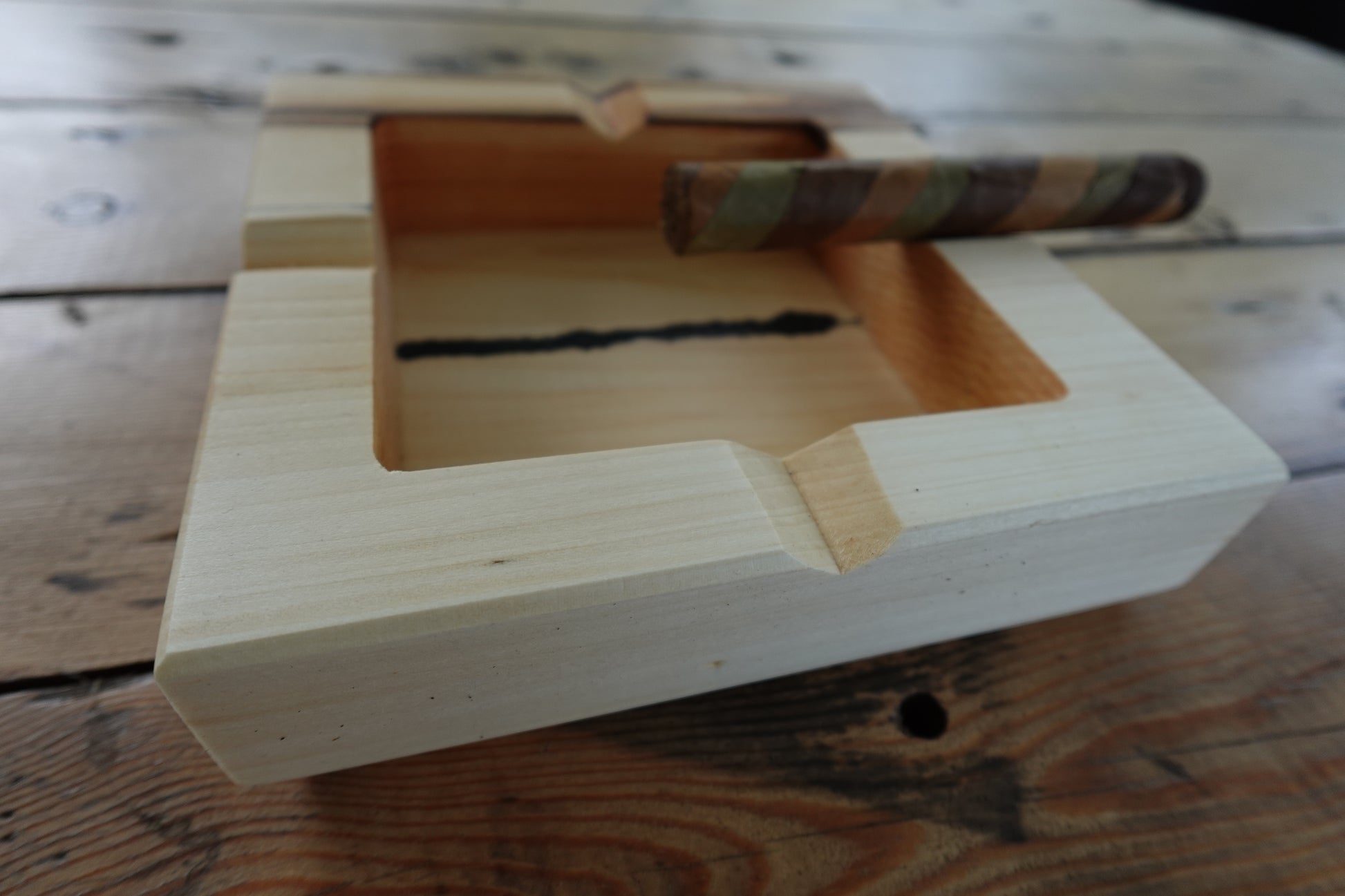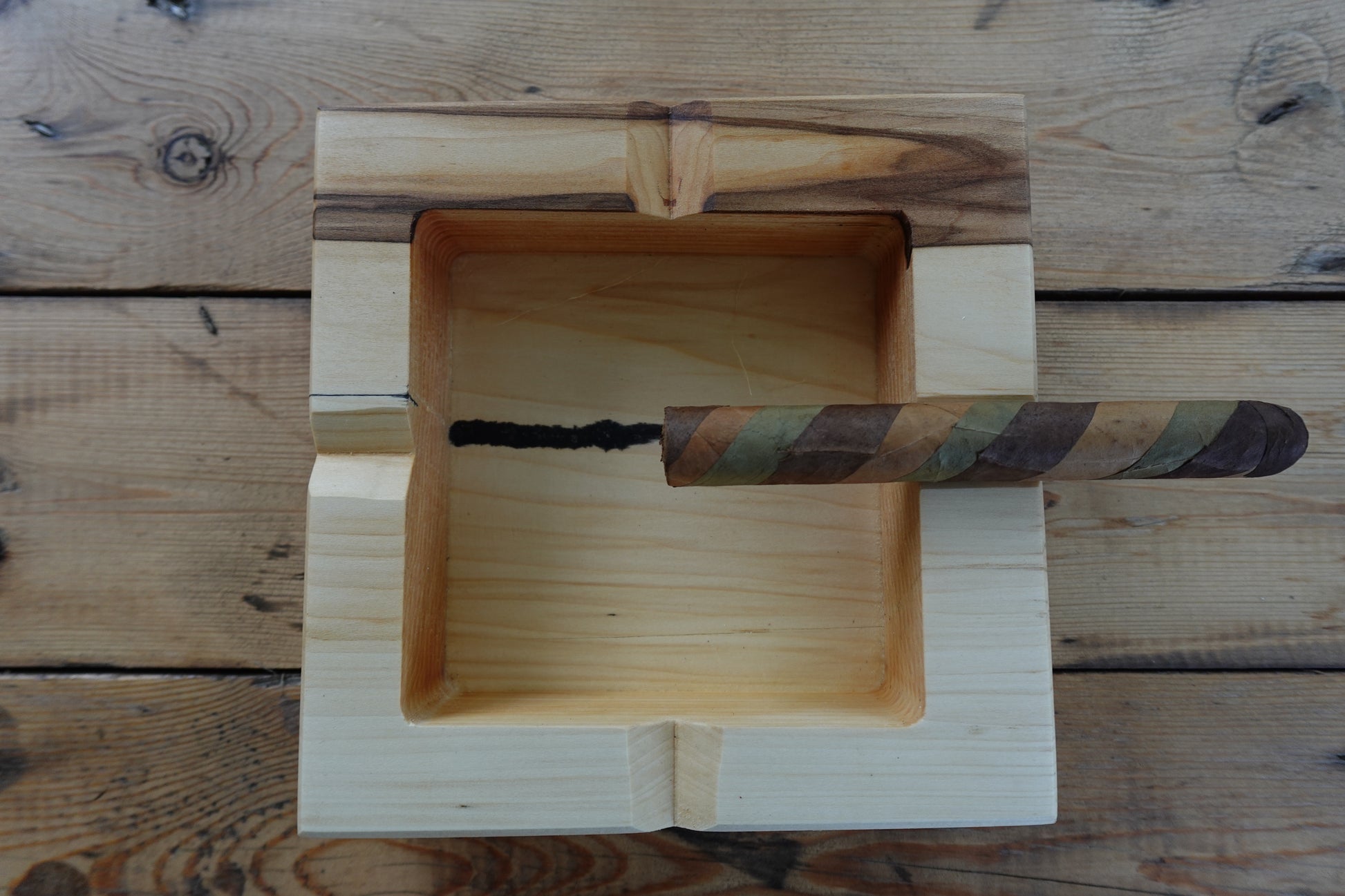This Indiana Pine Large Cigar Ashtray has 4 V slots and a beveled base, providing a sturdy and stylish option for ash disposal. With gorgeous grain variations and a food-safe oil finish, this 8" x 8" x 2" ashtray is perfect for any cigar aficionado.
