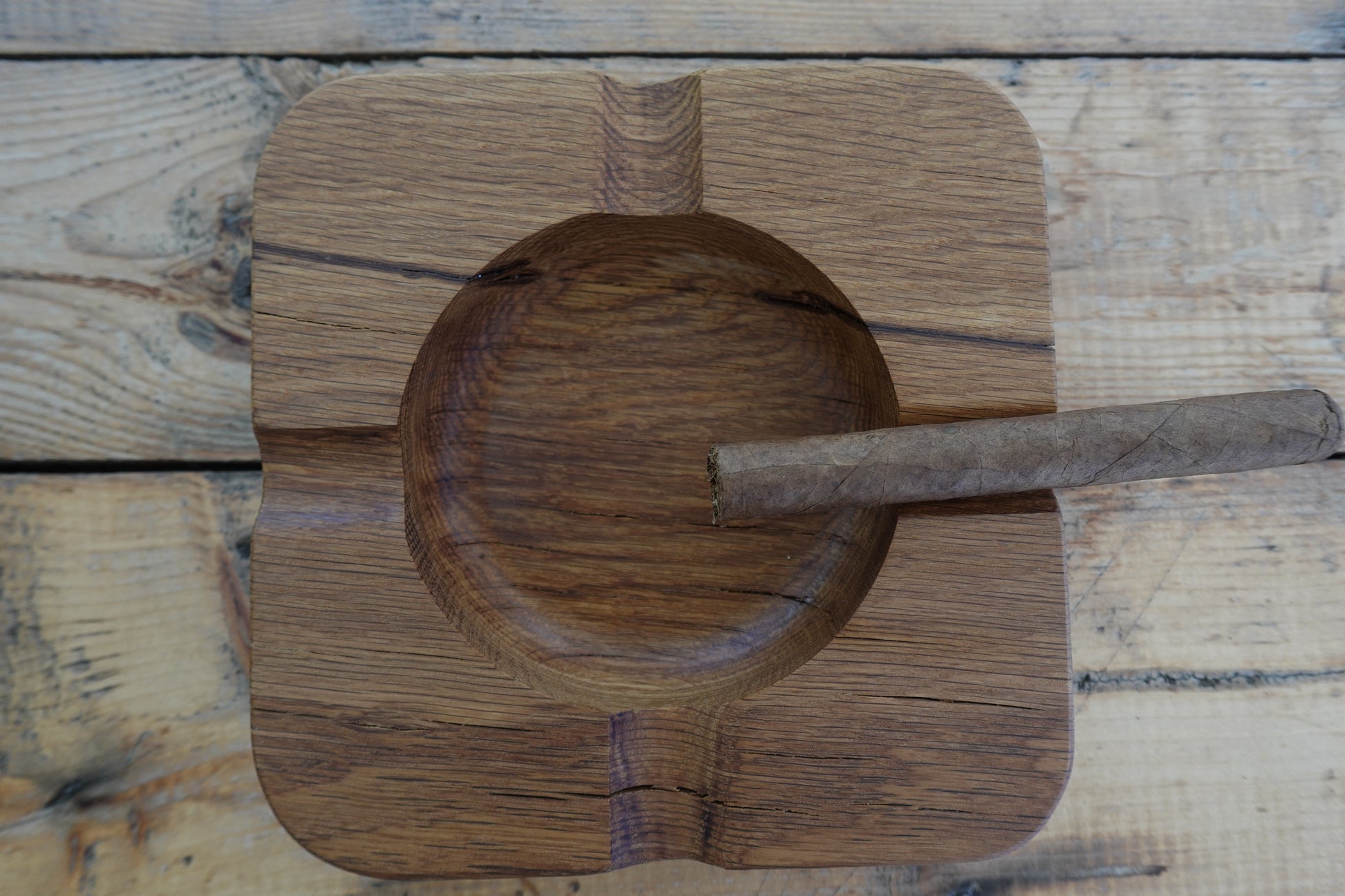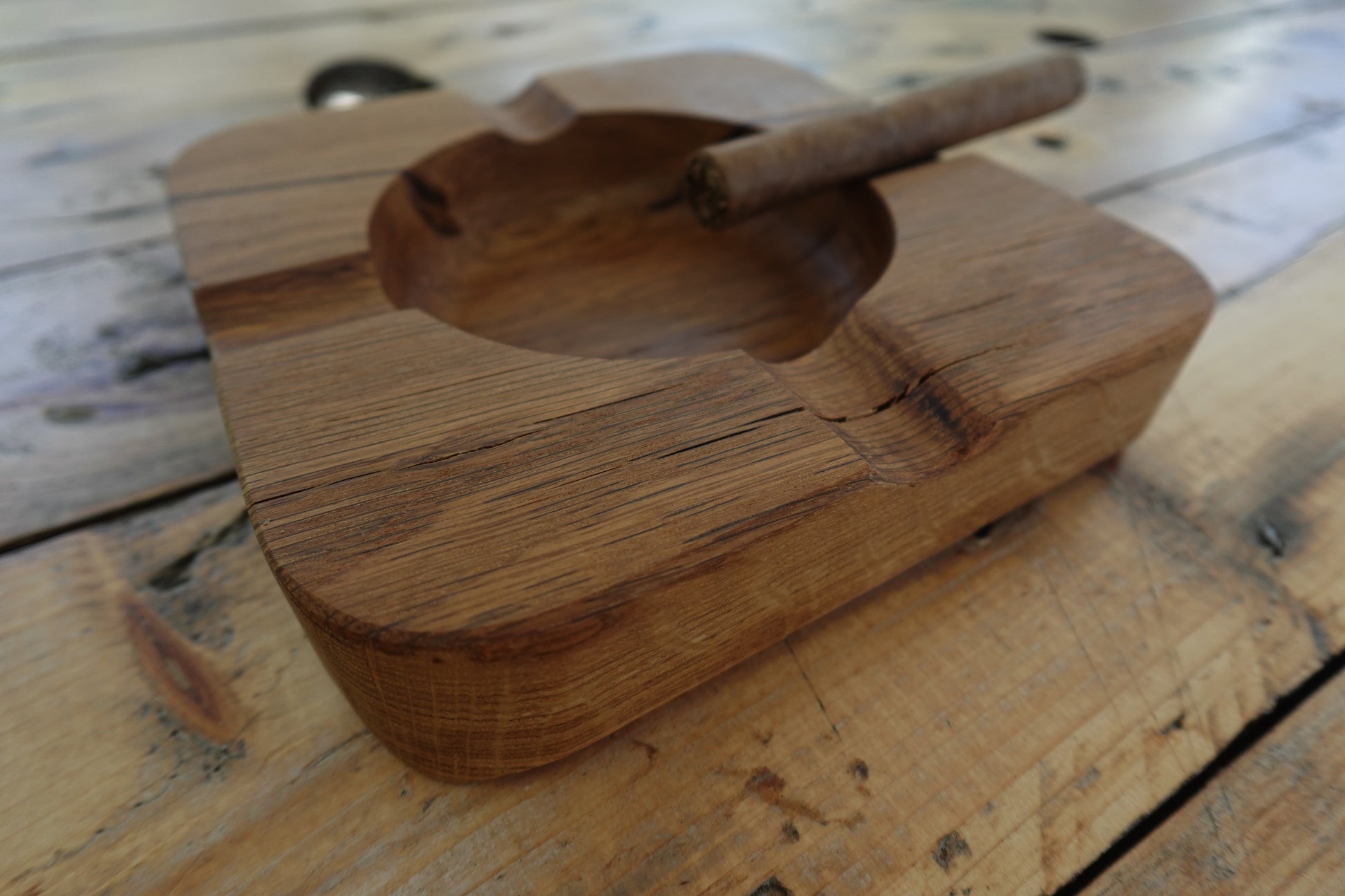 Crafted from Indiana White Oak and finished with food-safe oil, this 4 slot cigar ashtray not only boasts a beautiful design but also ensures practicality and safety. Perfect for any cigar enthusiast, it adds a touch of elegance to any smoking experience. Roughly 8" x 8" x 2"