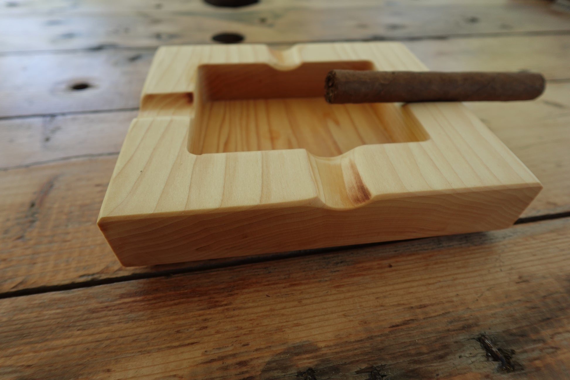 This Indiana Pine four slot cigar ashtray features a beautiful figure and a food safe oil finish. Keep your cigars in style while enjoying the benefits of food-safe materials and a stunning design. A must-have for any cigar aficionado. Roughly, 8" x 8" x 1.5-2".