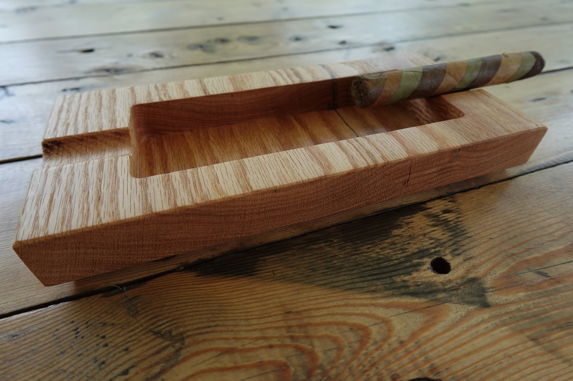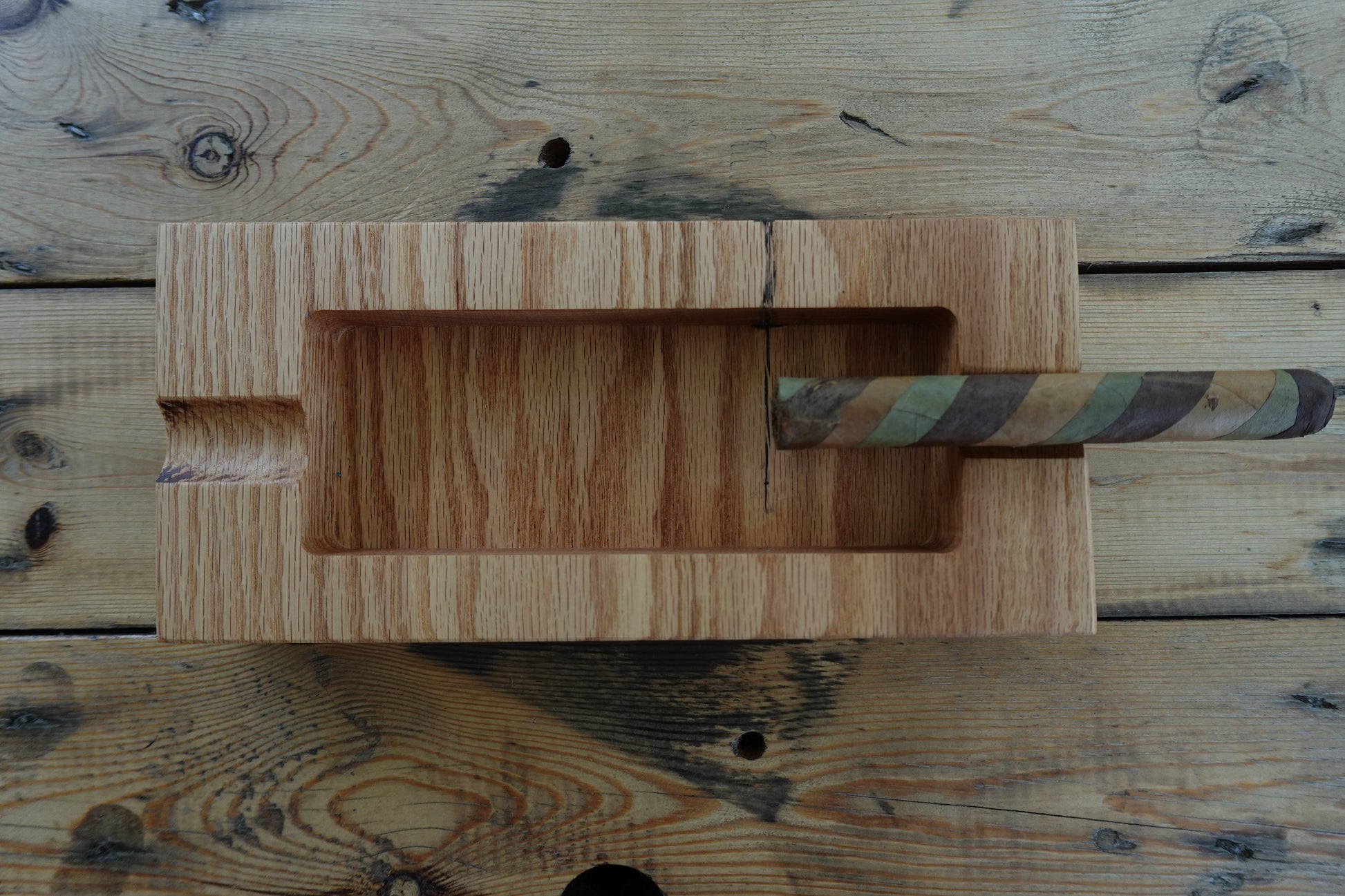 This 11.5" x 5" x 1.75" Red Oak cigar ashtray, sourced from Indiana, is expertly crafted with 2 slots and an 8" x 3" x 1" interior tray for maximum ash capacity. Its food safe oil finish and beautiful grain variations make it both stylish and functional.