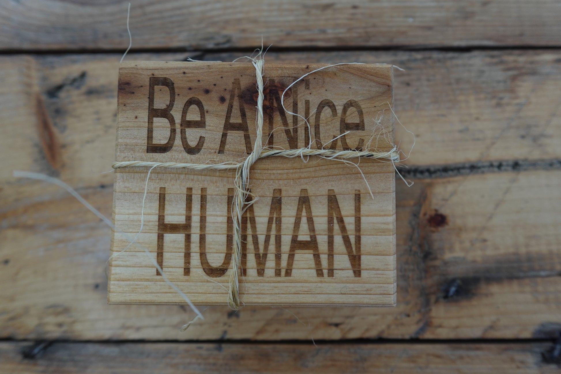 Protect your furniture and send a powerful message with our Be A Nice Human Hardwood Coasters. Made from Indiana Hardwood and finished with a food safe oil, these coasters not only add an elegant touch to your home, but also promote kindness and positivity. Set of four included for maximum coverage.