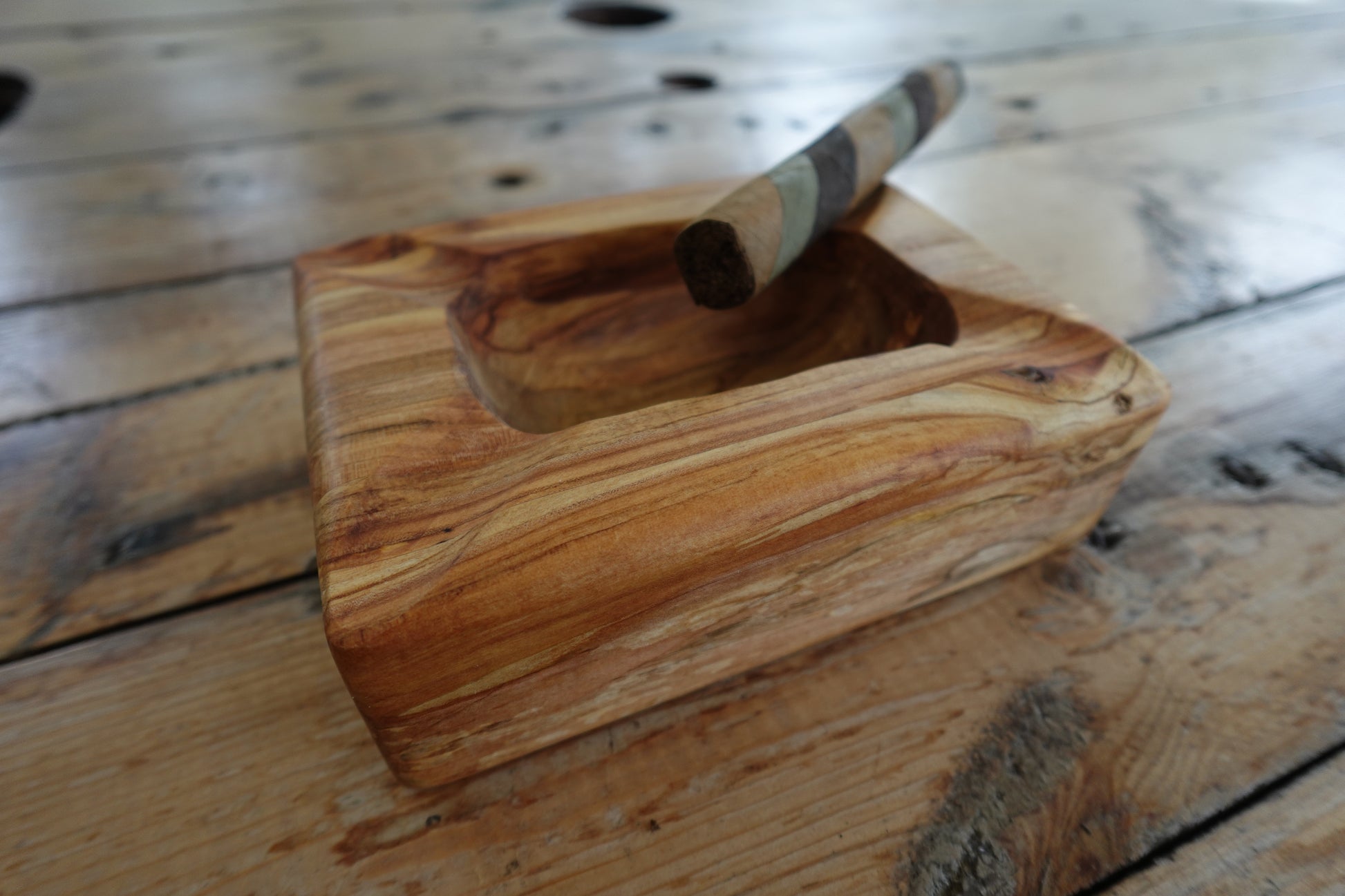 Handcrafted from premium Ambrosia Maple, this four-finger cigar ashtray showcases the wood's distinctive dark streaking and natural character. Each piece is individually finished with food-safe oil, enhancing the grain while providing durable protection. The ergonomic design accommodates four cigars comfortably, making it an essential accessory for the discerning aficionado. As a one-of-a-kind creation, this ashtray combines functional craftsmanship with artistic appeal—a refined addition to any collection or smoking space.