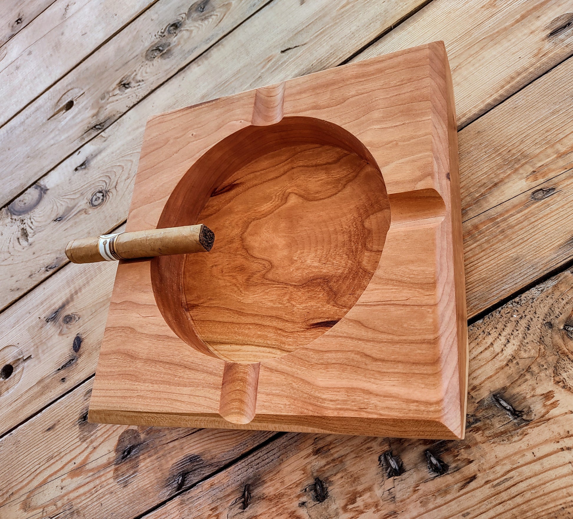 Expertly crafted from Indiana Cherry wood, this cigar ashtray features 4 slots and a food safe oil finish. Perfect for cigar enthusiasts, it adds a touch of elegance to any smoking experience. Enjoy the gorgeous design and practicality of this unique ashtray. Roughly, 10" x 10" x 2.5"