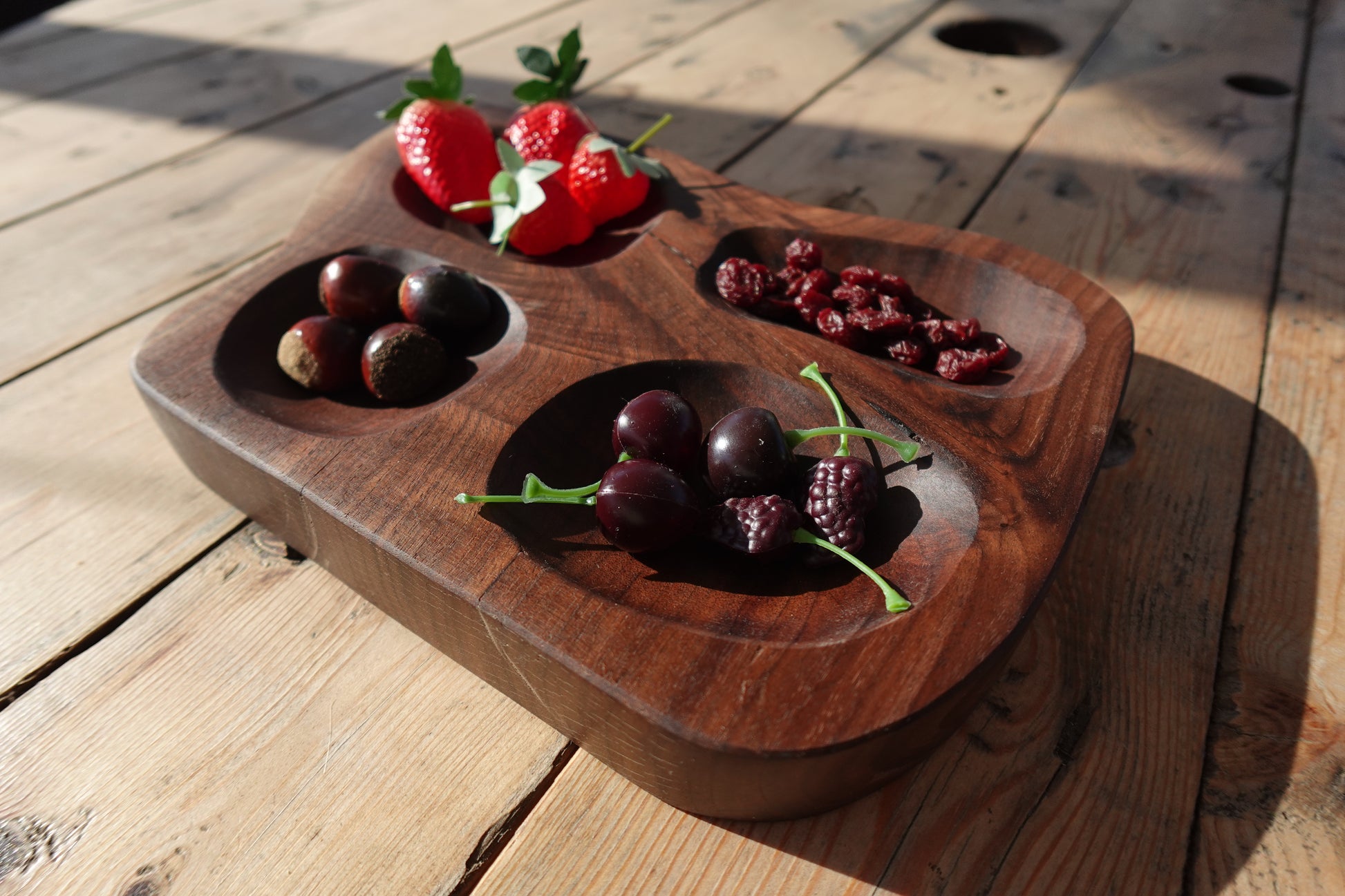 Crafted from richly-figured gunstock walnut, our serving tray boasts 4 separate sections for organizing and showcasing your culinary creations. Elevate your hosting game with this stunning, yet functional piece that will surely impress your guests. Its unique beauty will add a touch of elegance to any occasion.