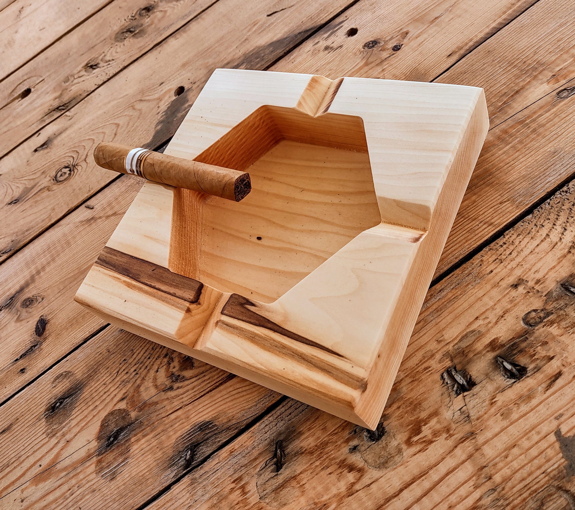 Expertly crafted from Indiana Pine, this cigar ashtray measures roughly 7.7 x 7.5 x 1.5 and features 4 slots and a hexagonal tray. The food safe oil finish adds a touch of sophistication to your smoking experience. Enjoy your cigars with ease and style.