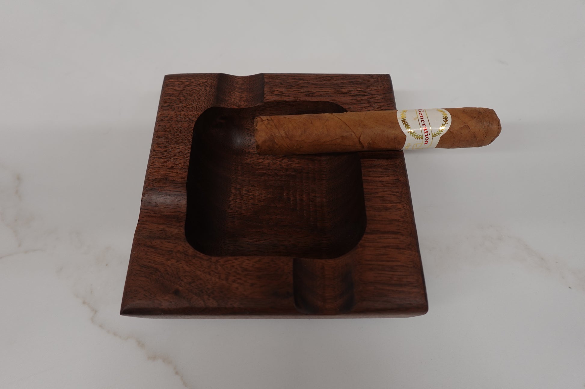 Upgrade your cigar game with our limited release Indiana Bourbon Club Walnut 4 Slot Ashtray. Crafted with expert precision and food-safe oil finish, this heirloom-quality ashtray proudly displays the club logo. Enhance your smoking experience and be the envy of your club buds. Get yours today! Dimensions, roughly, 5.25 x 5.25 x 1.625