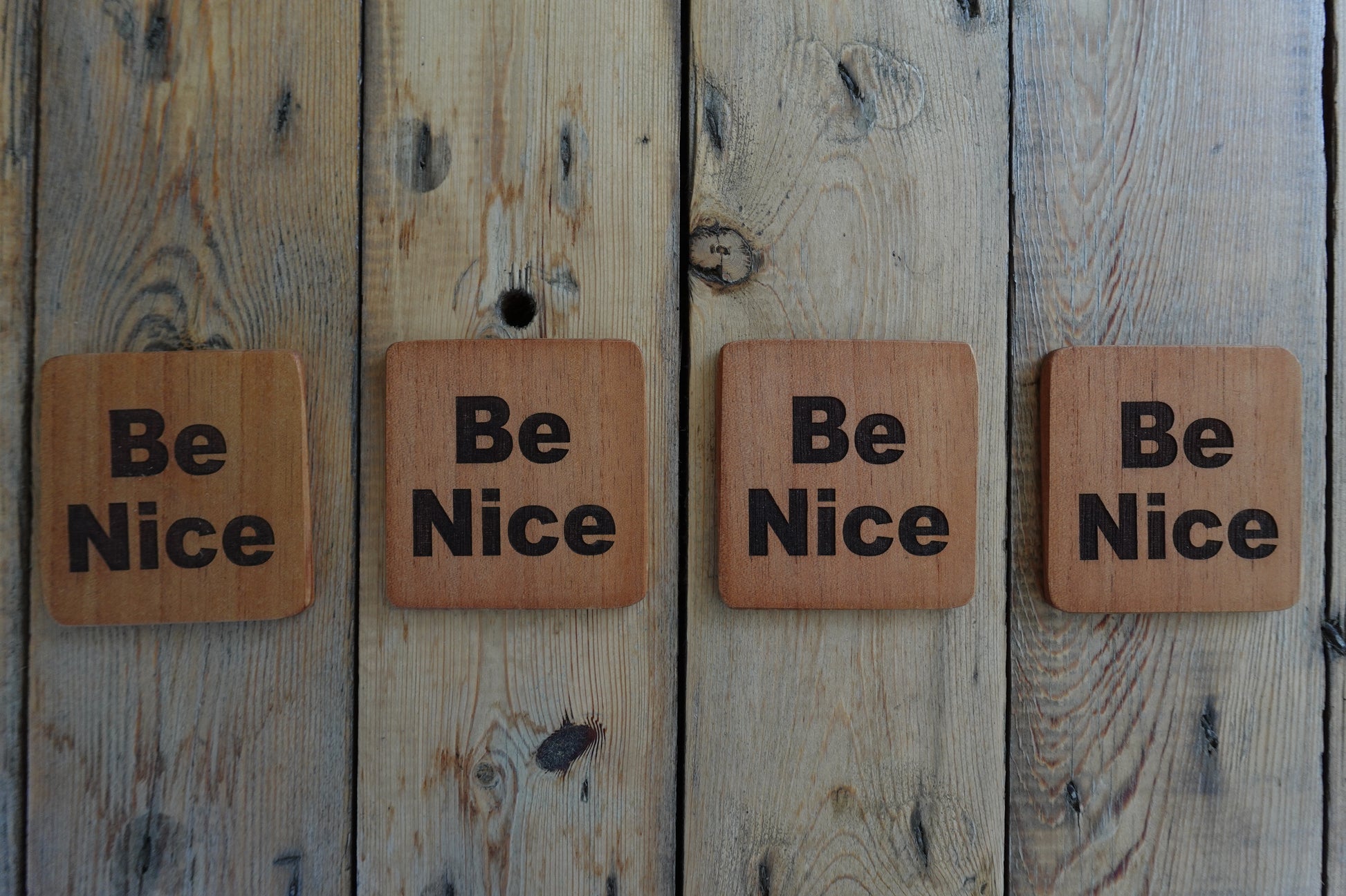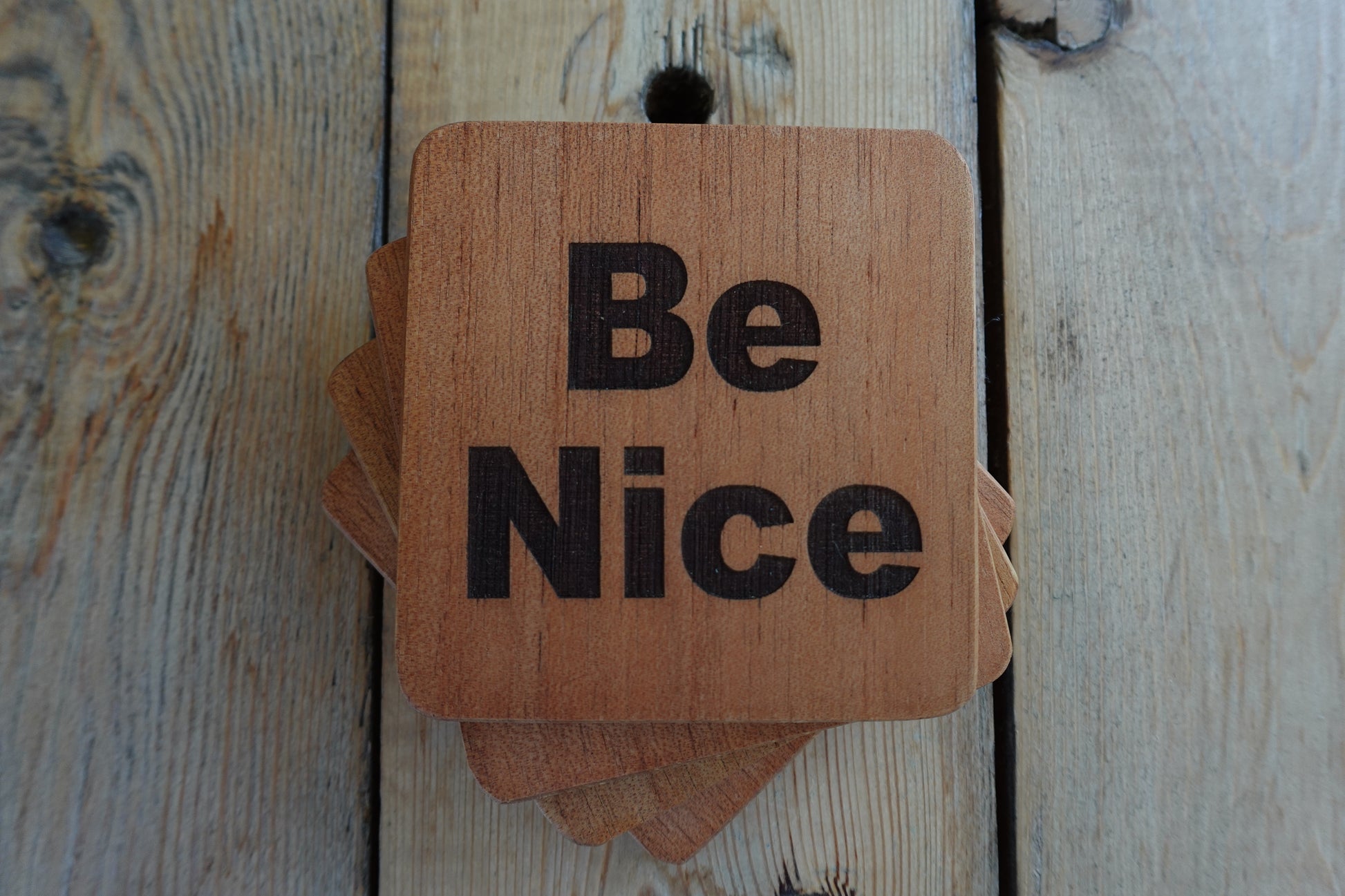 These Indiana Cherry Wood Coasters are a beautiful and functional addition to any home. Made from sustainably sourced cherry wood, these coasters are both durable and environmentally friendly. Featuring the phrase "Be Nice," they serve as a reminder to always spread positivity.