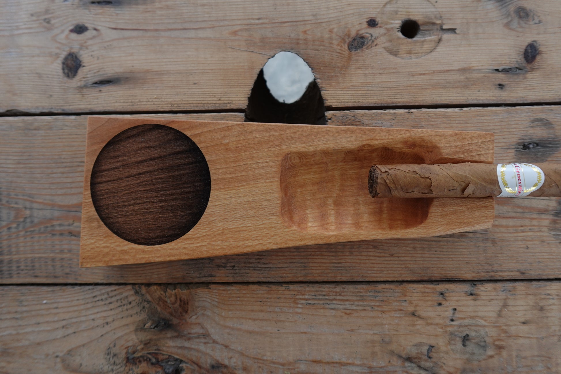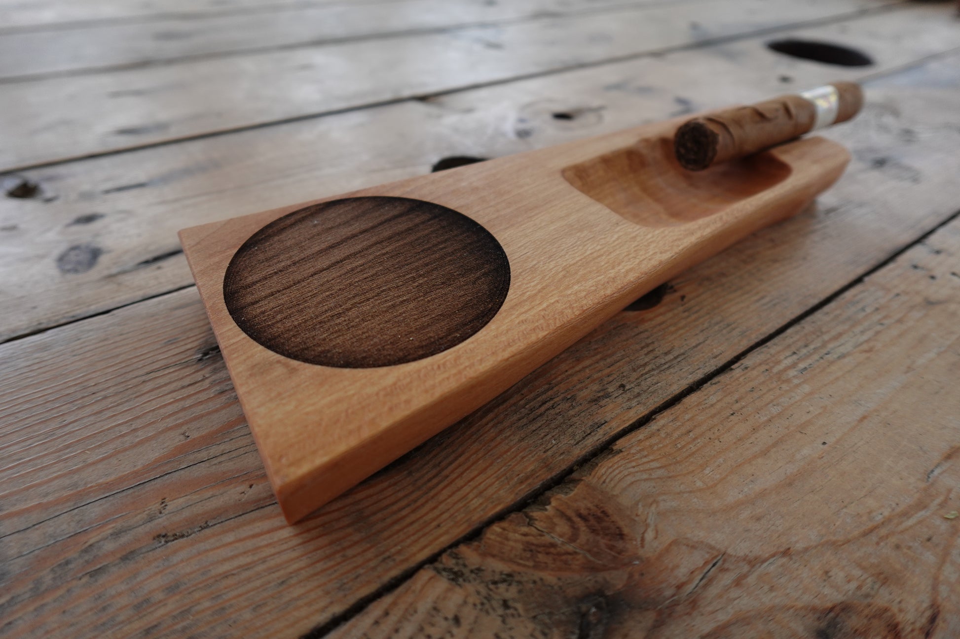 Upgrade your cigar experience with the Indiana Hickory Single Stick Cigar Ashtray. Expertly crafted for solitary smokers, this food safe oil finished ashtray is a must-have accessory. Elevate your smoking game with this functional and beautiful piece of art.