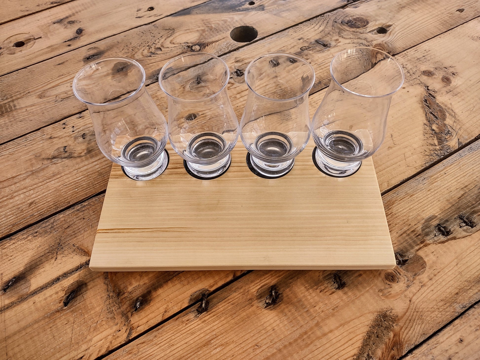 The Indiana Pine GC1 is a customizable Glencairn 4 Flight Board crafted from pine wood. Personalize it with your name, initials, or logo for a unique touch. This high-quality flight board provides an elegant and personalized way to enjoy your favorite spirits. Finished with food safe oils. Roughly 10" x 6" x 1: Does not included glasses.