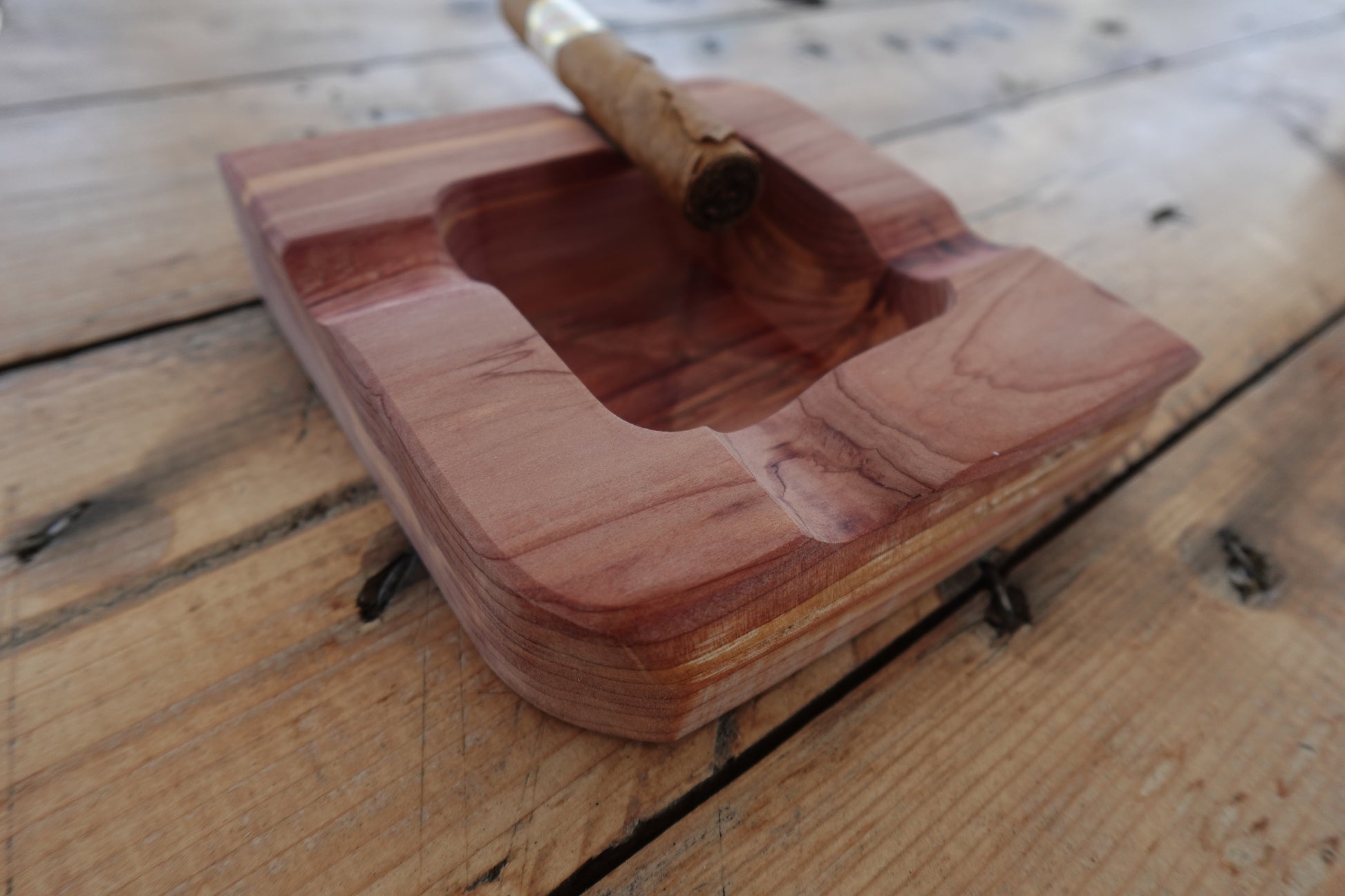 Expertly crafted with beautiful grain, the Indiana Red Cedar 4 slot cigar ashtray is perfect for cigar aficionados. Its food safe oil finish ensures long-lasting quality. Enhance your smoking experience with this stunning ashtray.