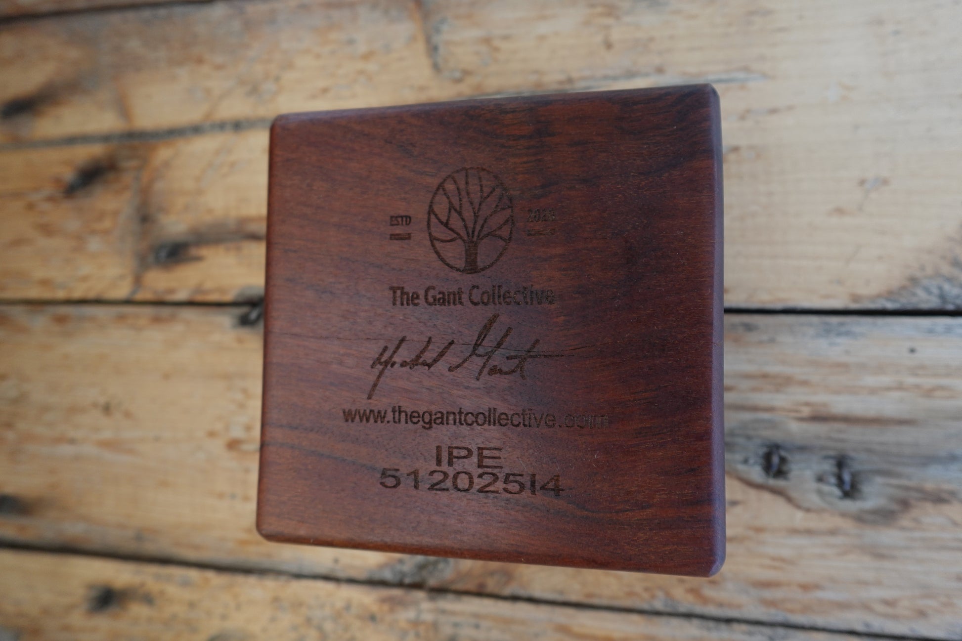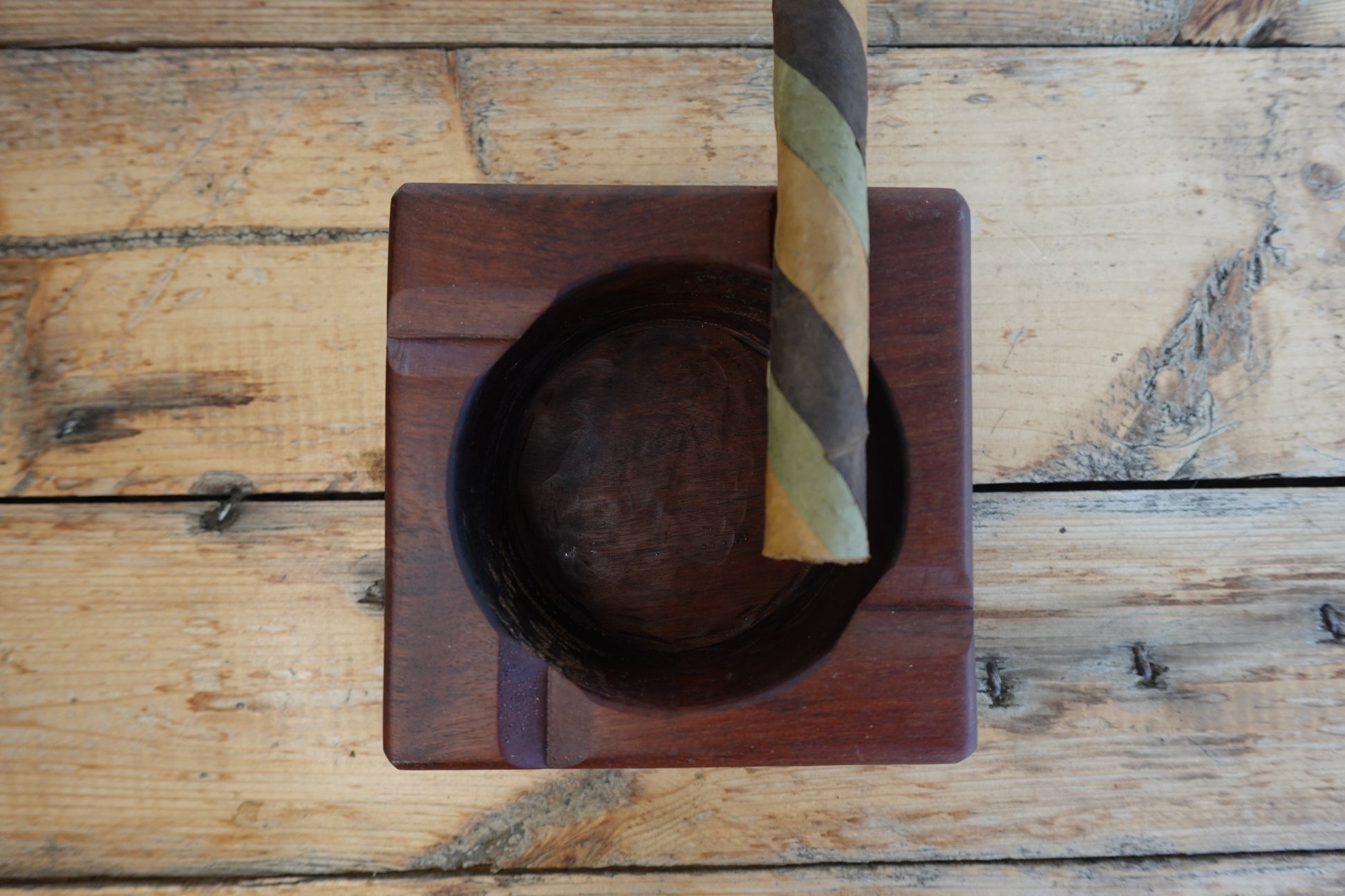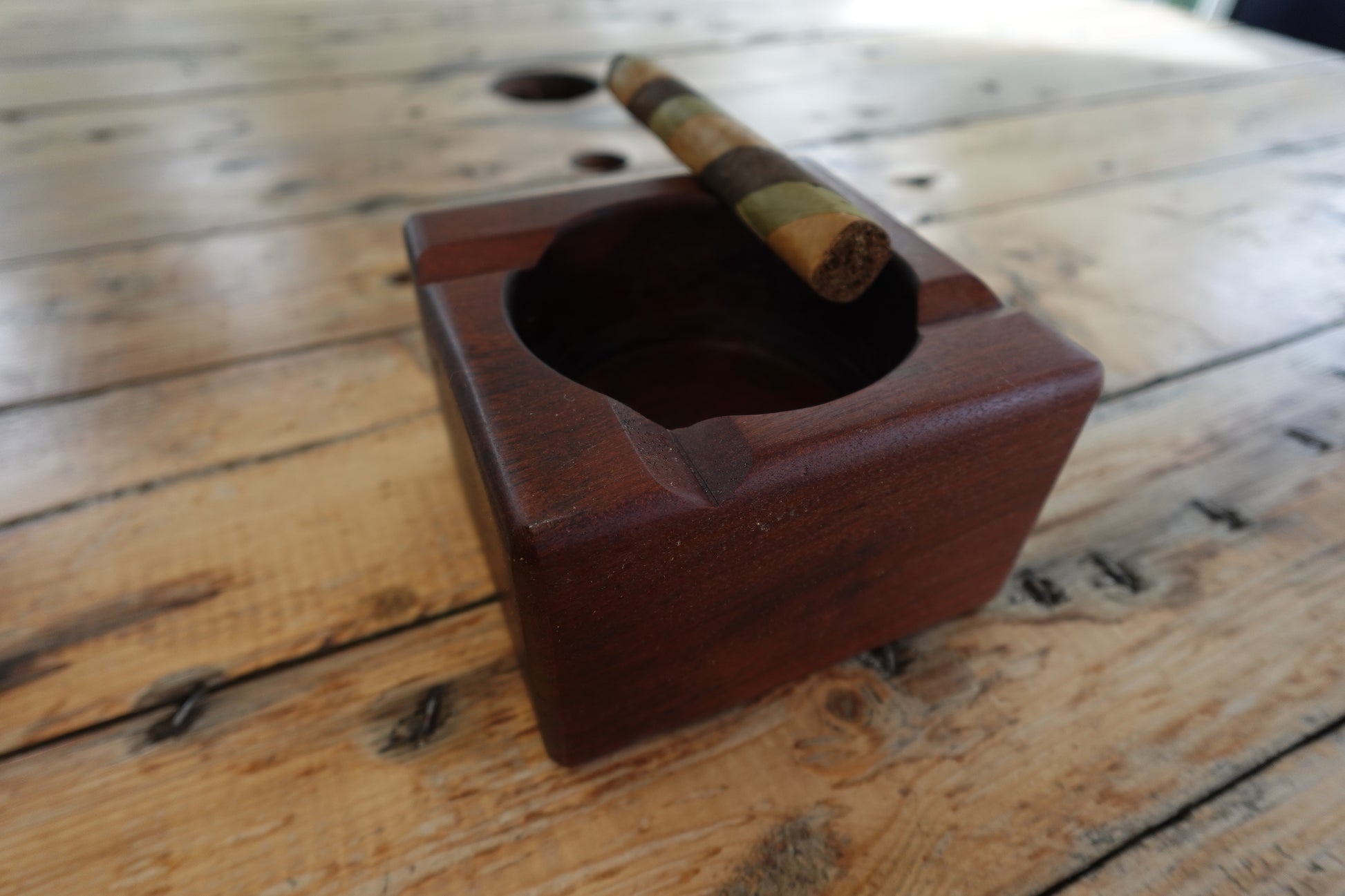 Handcrafted from Brazilian Ipe wood, this four-finger cigar ashtray combines exceptional durability with refined design. The deep bowl accommodates ash and debris while offset fingers provide secure cigar placement. Ipe's natural density ensures weather resistance, making it ideal for patios and outdoor spaces where it withstands extended exposure. Smooth, rounded edges on top and bottom enhance both comfort and aesthetics. A sophisticated addition for the discerning cigar enthusiast.