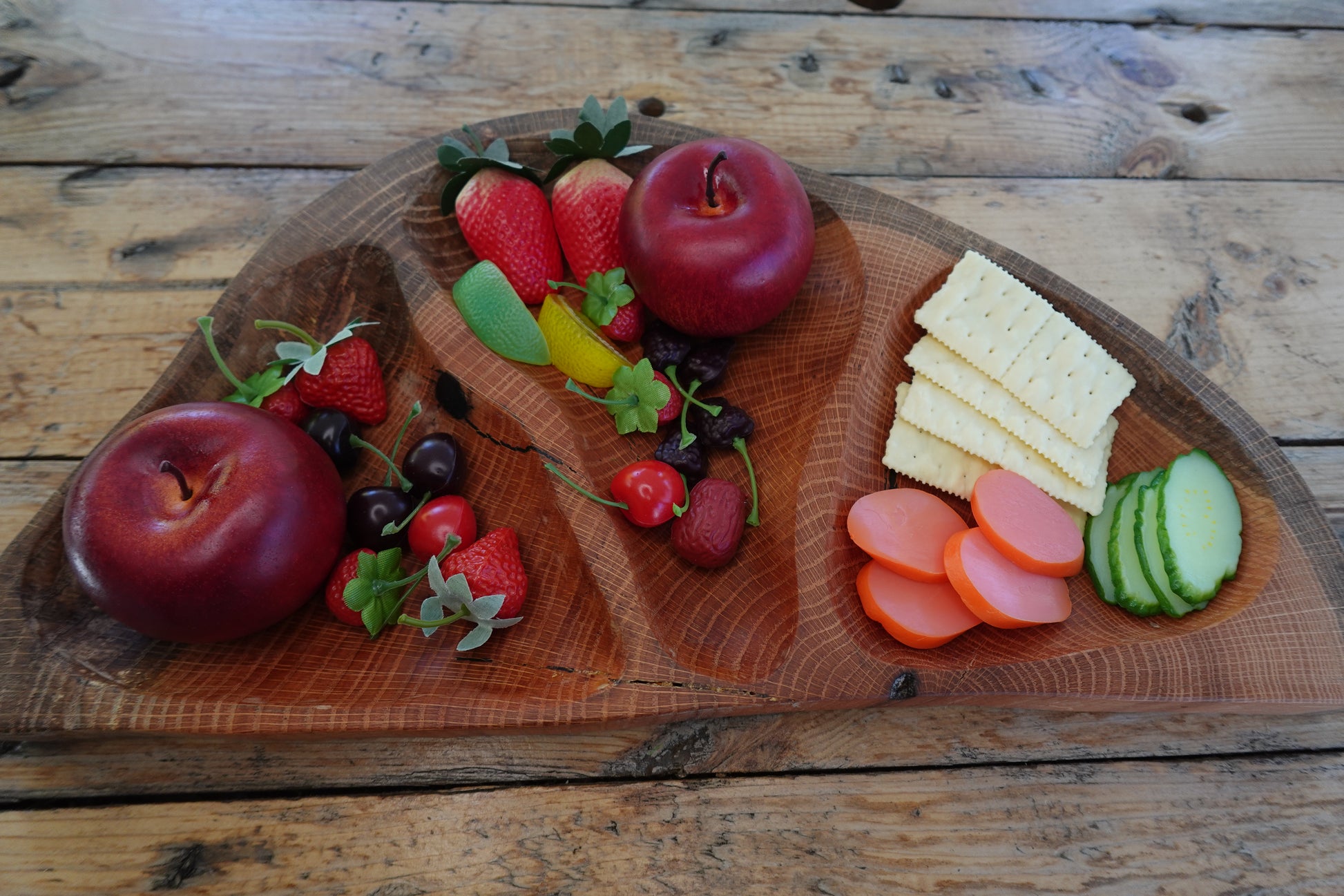 This handcrafted Missouri Red Oak serving tray showcases nature's artistry through its striking grain patterns and three thoughtfully designed serving sections. Each piece is expertly power carved to enhance the wood's natural character while maintaining structural integrity. The distinct compartments provide practical organization for cheeses, charcuterie, appetizers, or beverages, making it equally suited for entertaining or everyday use. The rich, warm tones of red oak develop a beautiful patina over time, ensuring this tray becomes a cherished piece that improves with age and use.