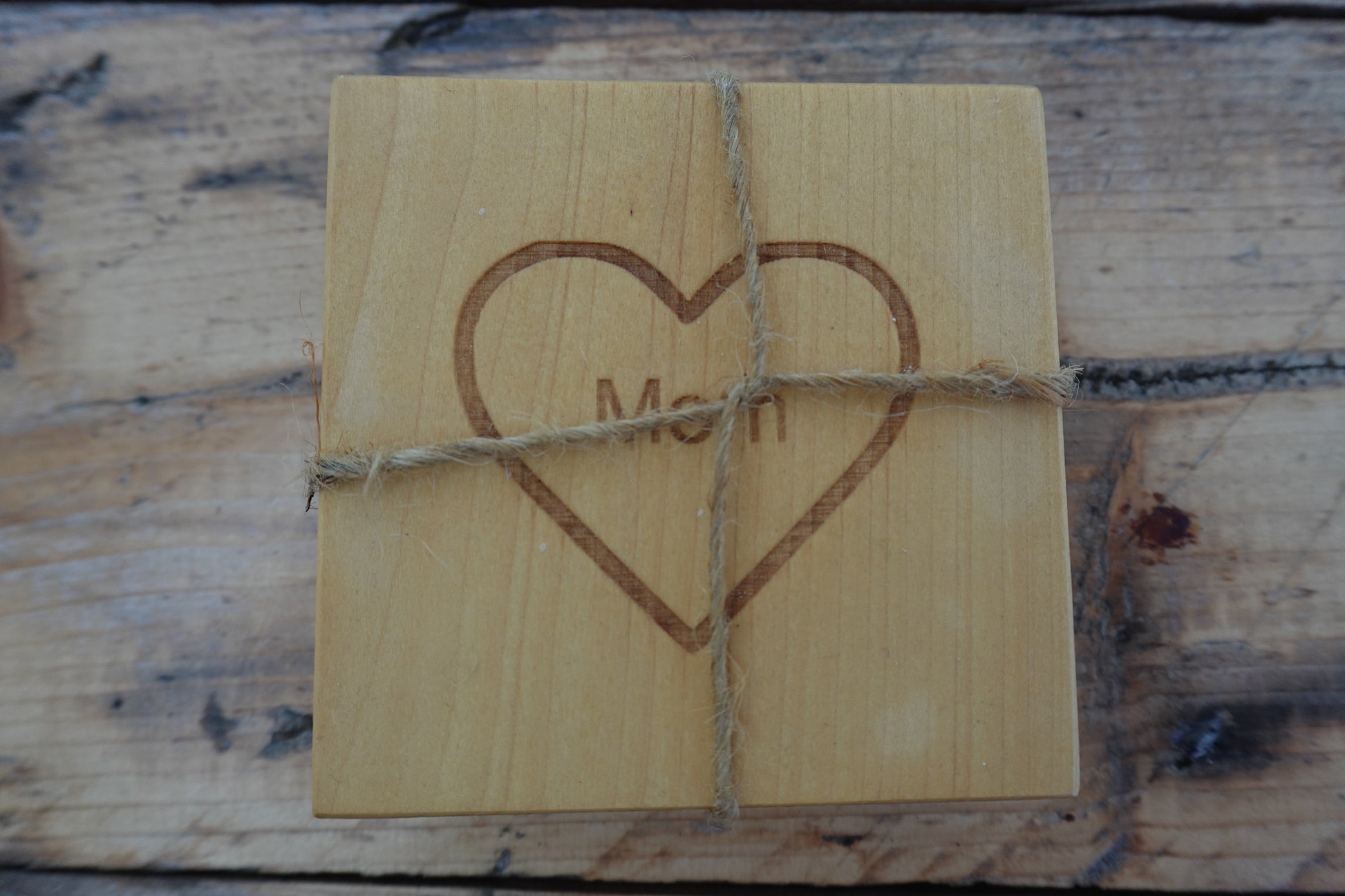 These "Mom" Heart Indiana Hardwood Coasters will show your love for your mother while protecting furniture with a food safe oil finish. A heartfelt reminder for a treasured parent. Set of four.