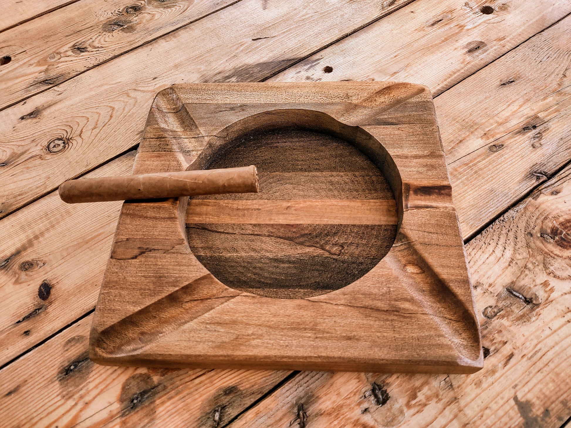 Our Multi-Species Cigar Ashtray is the perfect accessory for any cigar aficionado. With 4 slots, you can share with friends or enjoy multiple cigars yourself. Coated with a food safe oil finish, it's both functional and beautifully crafted. Each ashtray is unique, adding a stylish touch to your smoking experience. Approx. 9.5" x 9.5" x 1.75. 1.25" tray depth