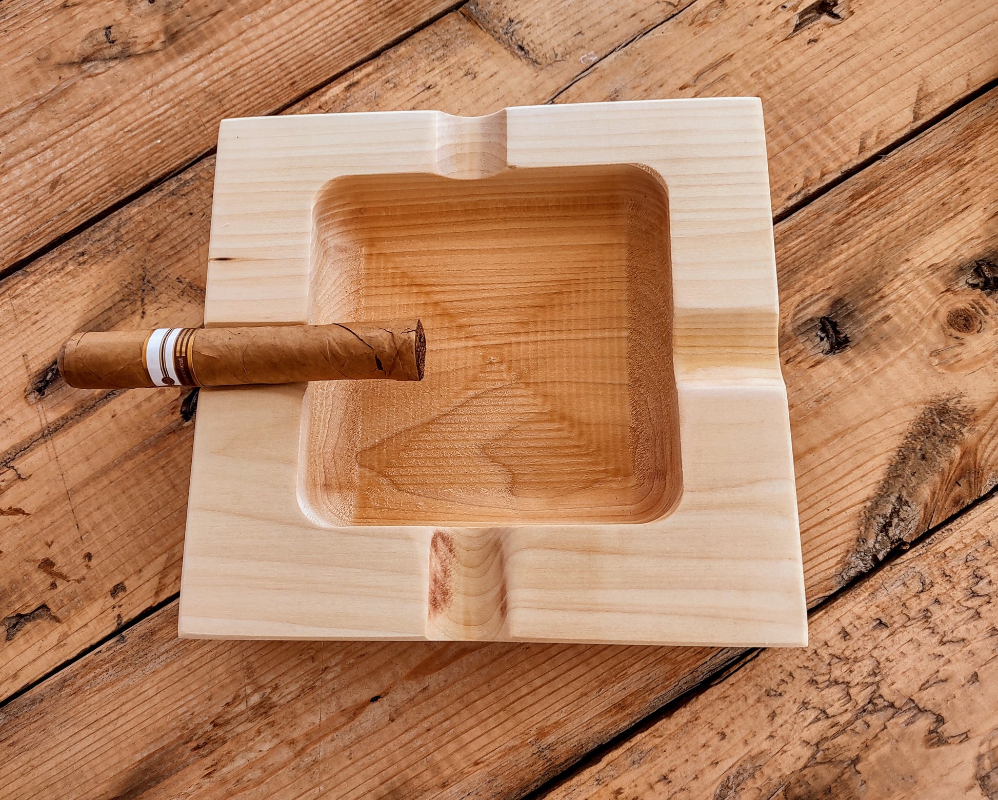 Expertly crafted from Indiana Pine, this Cigar Ashtray boasts a food-safe oil finish for added durability. With four slots, it's perfect for hosting a group of smokers. Measuring roughly 8" x 8" x 2", it's a functional and stylish addition to any smoking lounge.