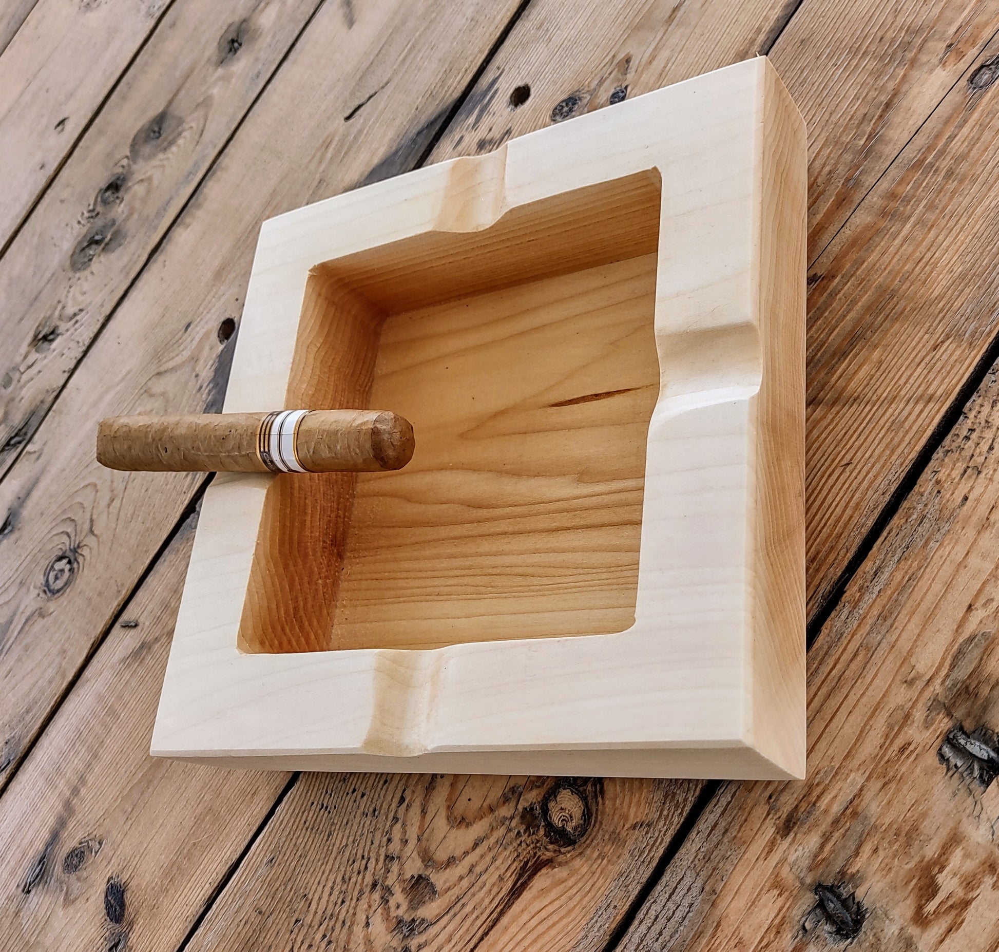 Expertly crafted from beautiful pine, this 4 slot cigar ashtray measures roughly 8" x 8" x 2" and is finished with food safe oil. Perfect for any cigar aficionado, enjoy your cigars with ease and style.