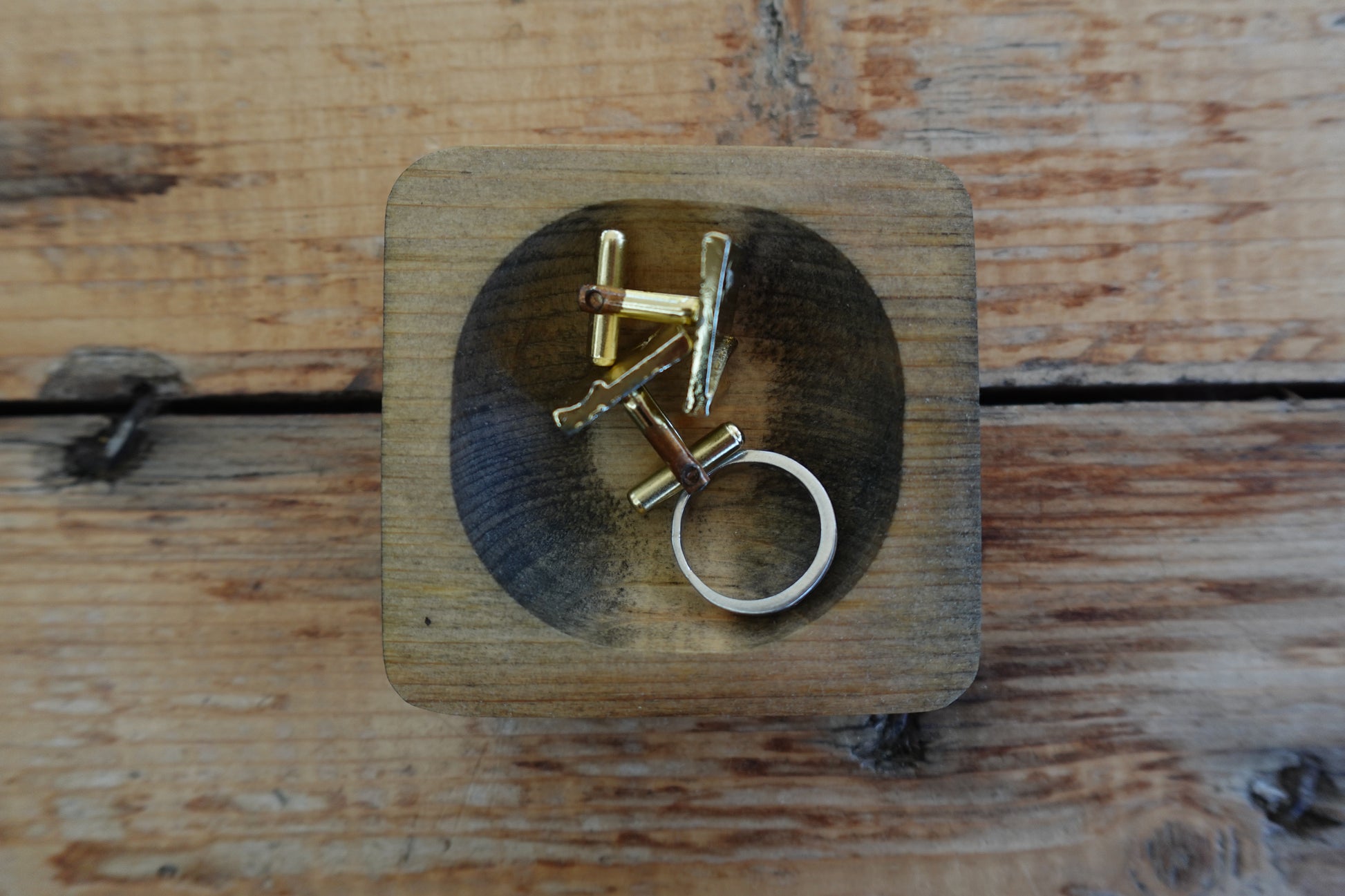 Handcrafted from Indiana pine, these power-carved ring trays feature an oil-finished surface that enhances the wood's natural grain. Each tray provides a dedicated space for organizing rings in any room—from the kitchen sink to the bedroom nightstand. The thoughtful design keeps your jewelry safely displayed and within reach. Sold individually; two available.