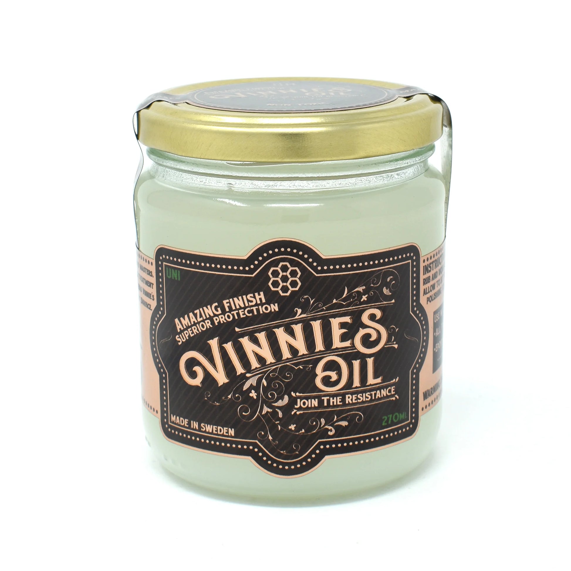 Vinnie's Oil surface treatment is a natural, solvent-free and non-toxic, hard wax oil consisting of several different solvent free oils with different deep-penetrating properties. As well as different waxes that deposit in layers on the surface and create a water-repellent effect. It gives a nice and slightly glossy finish to wood and smells of eucalyptus and coconut. Vinnies Oil is durable and lasts a long time.