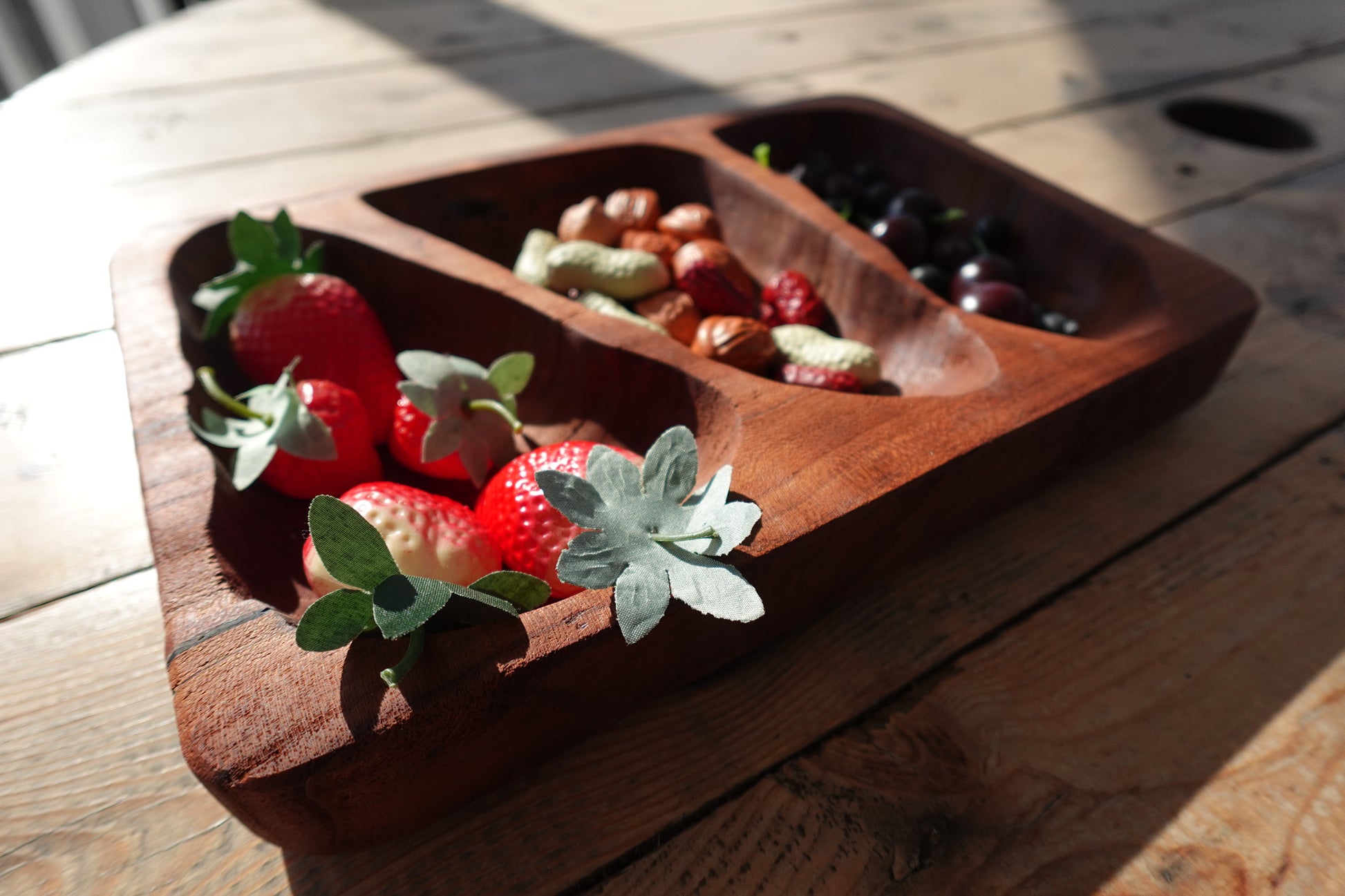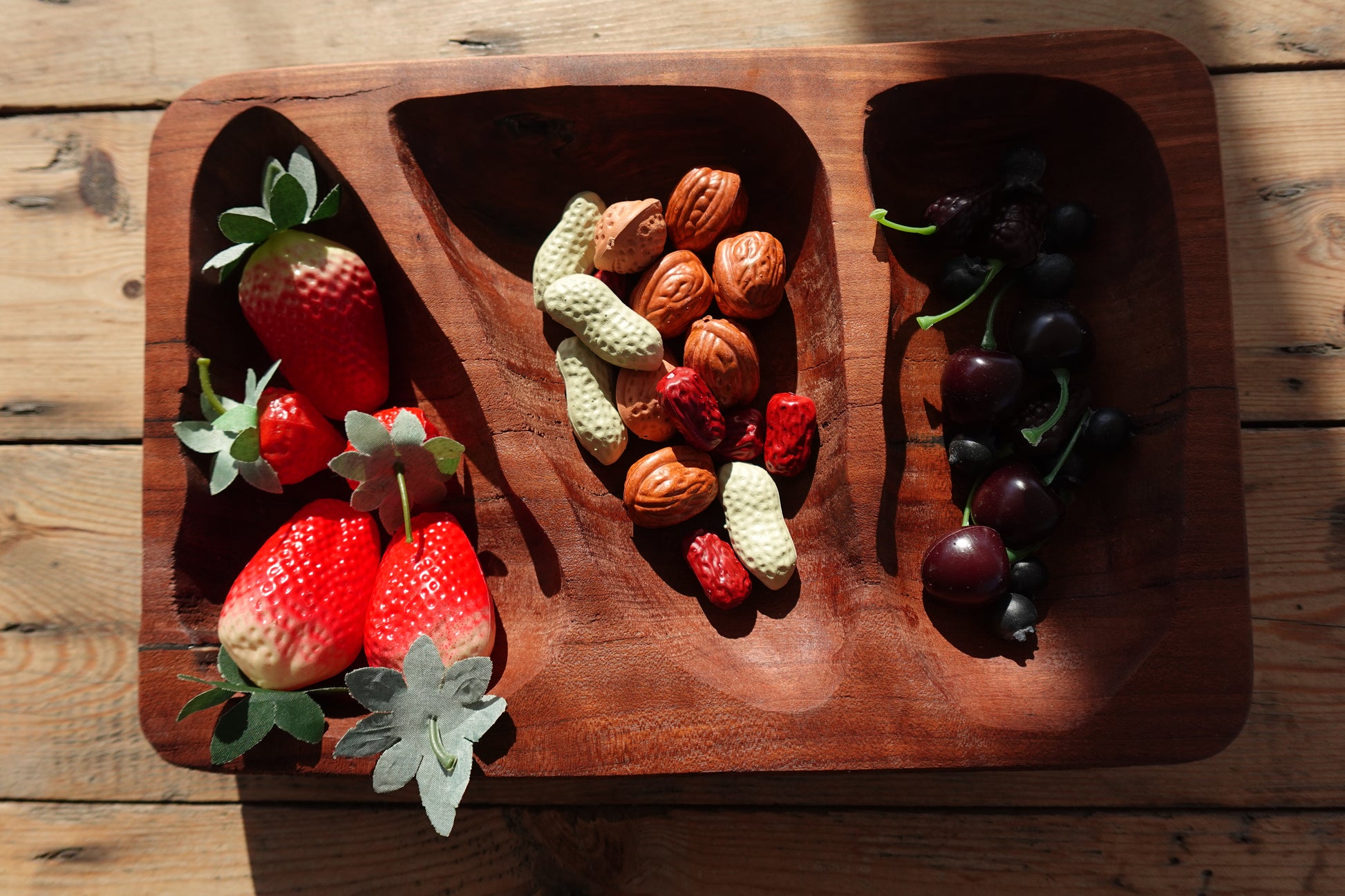 Crafted from beautiful Indiana Walnut, this expertly carved serving tray features three distinct sections for serving your favorite hors d'oeuvres or desserts. The food safe oil finish adds both a touch of elegance and protection to this one-of-a-kind piece. Elevate your hosting game with our Walnut Serving Tray.